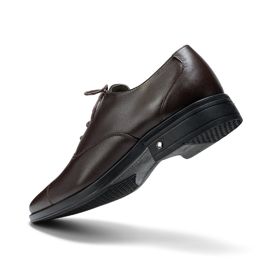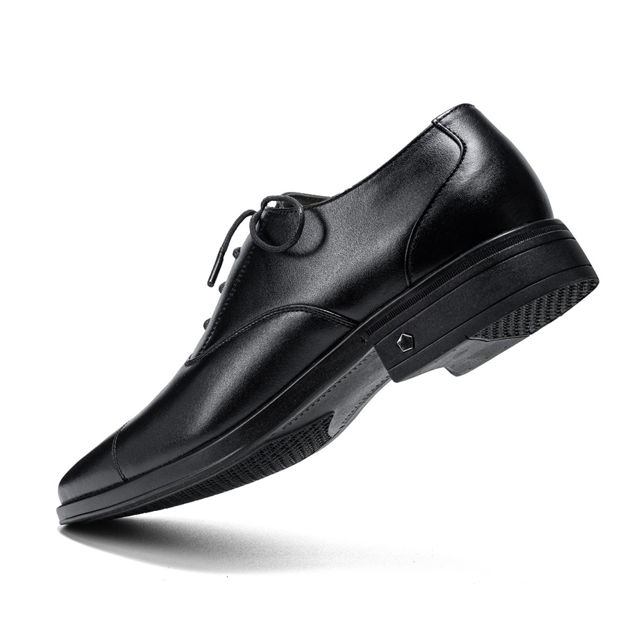 Điểm nổi bật của mẫu giày nằm ở chất liệu da tổng hợp bóng mịn, giúp tăng tính thẩm mỹ và dễ dàng vệ sinh. Form giày ôm gọn bàn chân, kết hợp với đường may thủ công sắc sảo tại mũi giày và thân trên, tạo nên tổng thể chỉn chu, mạnh mẽ. Phần mũi giày bo tròn nhẹ giúp tạo cảm giác cân đối khi di chuyển và phù hợp với nhiều dáng chân khác nhau.