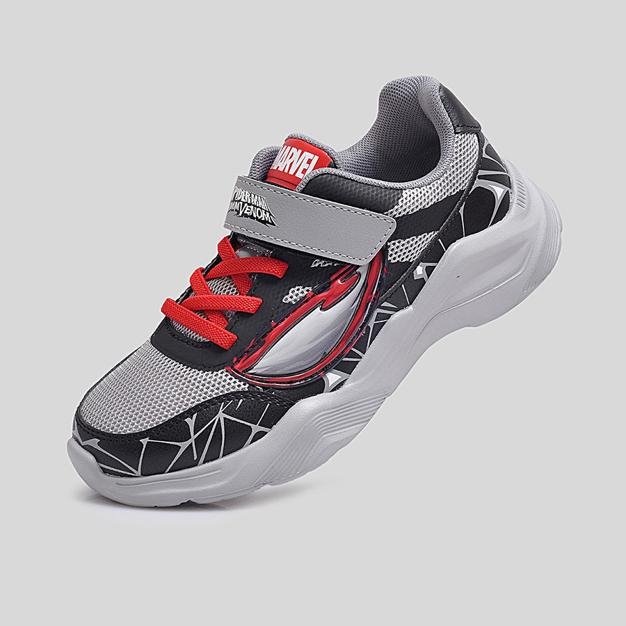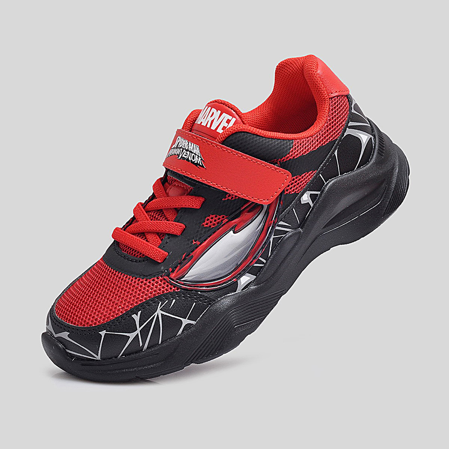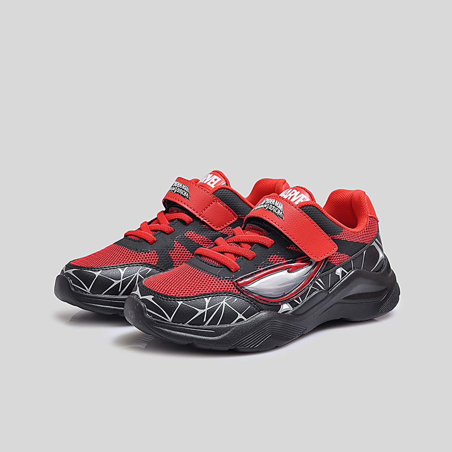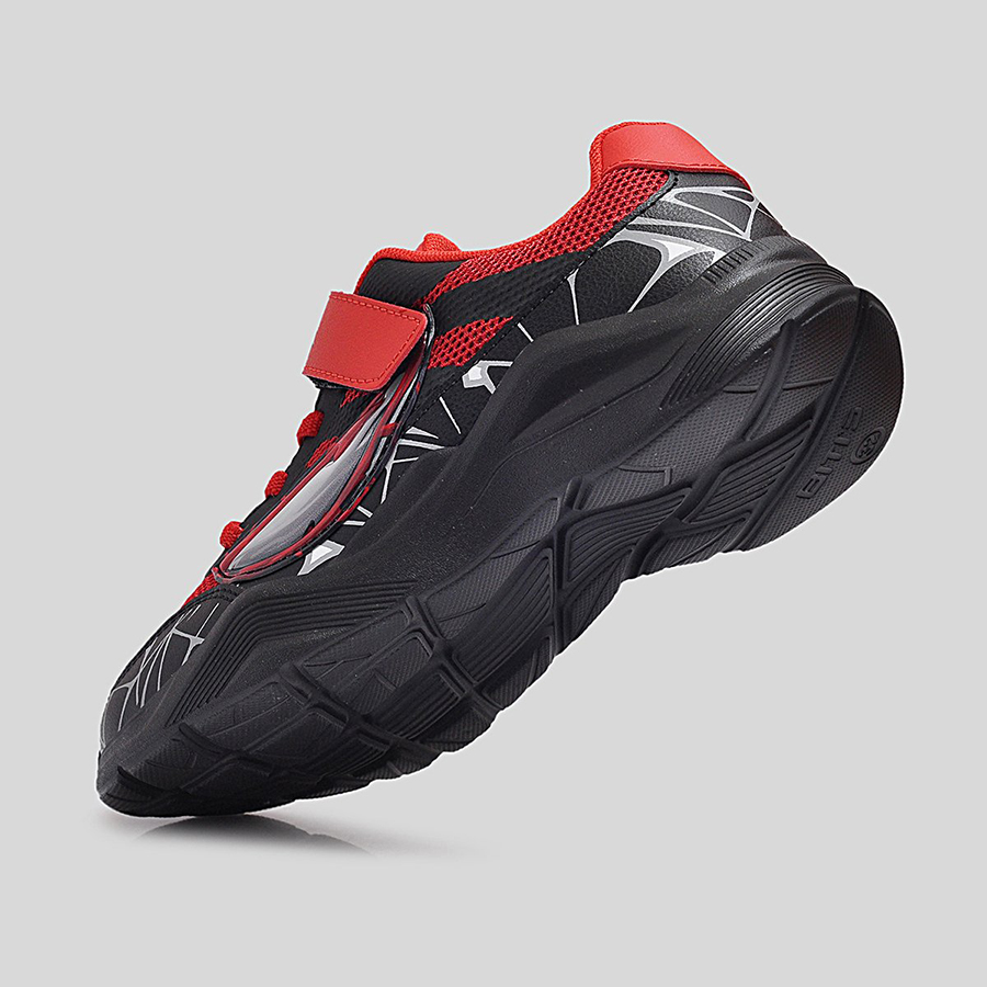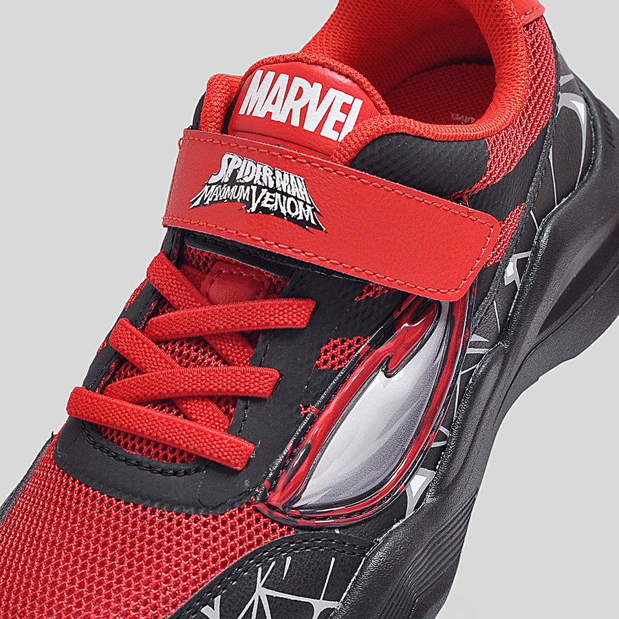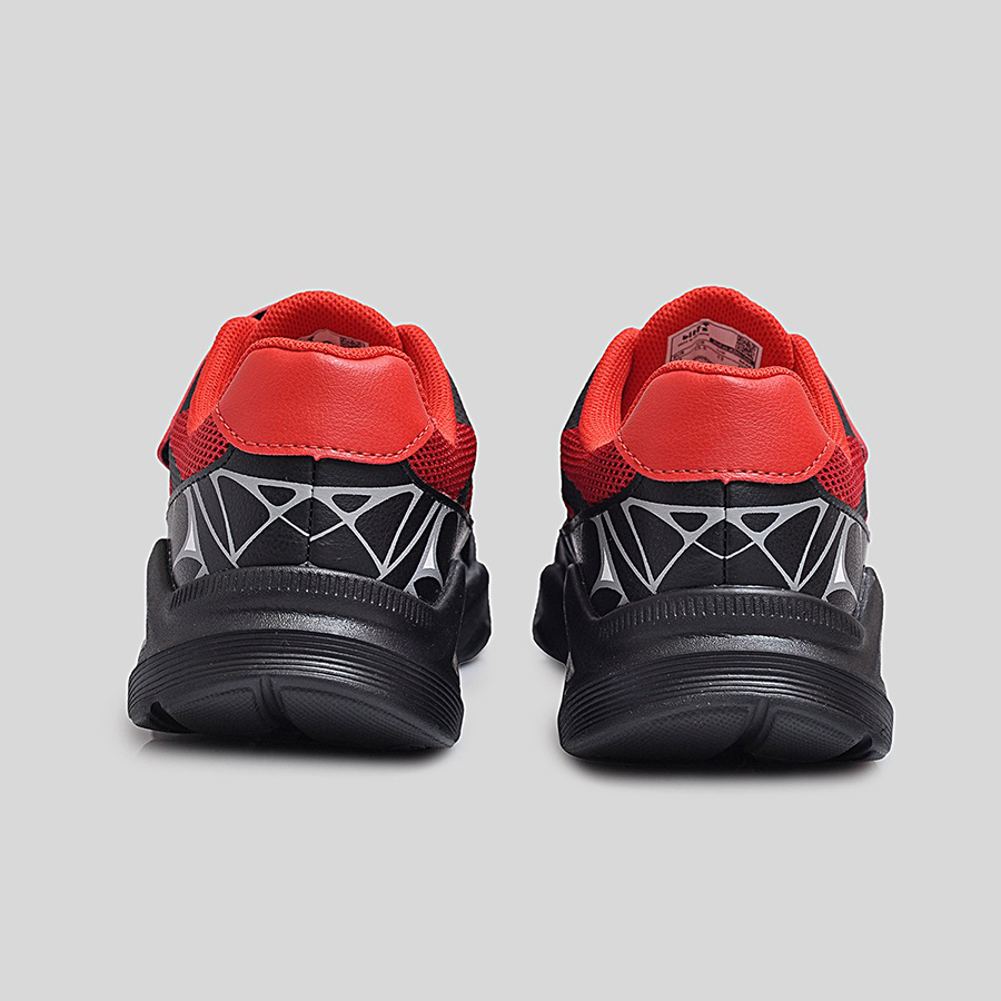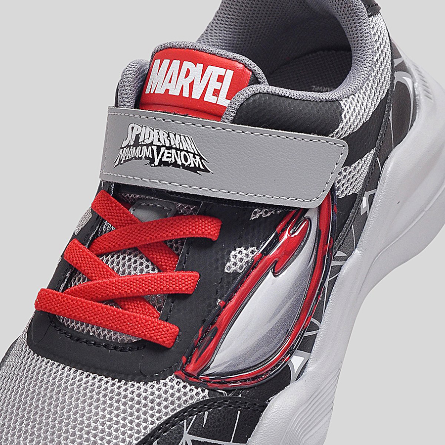 Điểm đặc trưng nổi bật chính là họa tiết mạng nhện 3D phủ quanh thân giày cùng logo Spider-Man Maximum Venom ở quai dán, giúp bé dễ dàng nhận diện và thêm phần hứng thú khi sử dụng. Thân giày bằng lưới thoáng khí kết hợp da tổng hợp bền bỉ, vừa tạo sự thoải mái vừa giữ phom dáng chắc chắn trong thời gian dài.